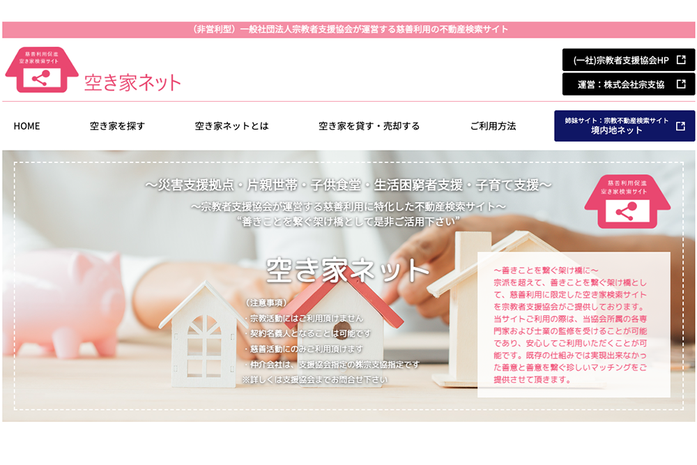 有償無償問わず、宗教者+信仰者の善意を慈善事業で物件を探されている方とマッチングをする珍しいサイトです